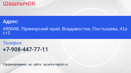 ШашлычОК по адресу 690048, Приморский край, Владивосток, Постышева, 41а ст1 в дальнейшем Организация, размещена в следующих категориях: