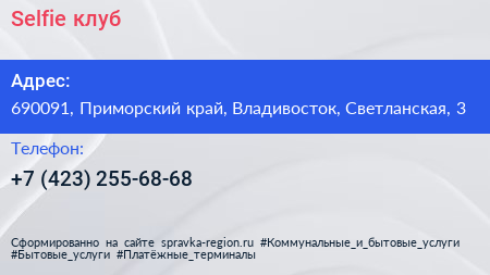 Selfie, клуб по адресу 690091, Приморский край, Владивосток, Светланская, 3 в дальнейшем Организация, размещена в следующих категориях:
