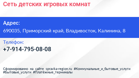 Сеть детских игровых комнат по адресу 690035, Приморский край, Владивосток, Калинина, 8 в дальнейшем Организация, размещена в следующих категориях: