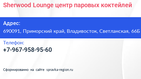 Sherwood Lounge, центр паровых коктейлей по адресу 690091, Приморский край, Владивосток, Светланская, 66Б в дальнейшем Организация, размещена в следующих категориях: