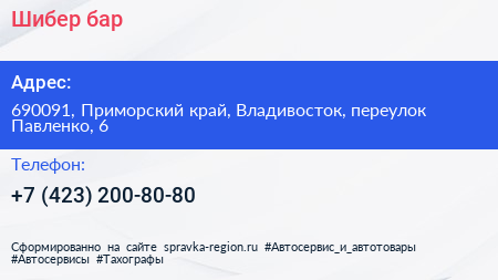 Шибер, бар по адресу 690091, Приморский край, Владивосток, переулок Павленко, 6 в дальнейшем Организация, размещена в следующих категориях: