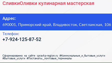 СливкиОливки, кулинарная мастерская по адресу 690001, Приморский край, Владивосток, Светланская, 106 в дальнейшем Организация, размещена в следующих категориях: