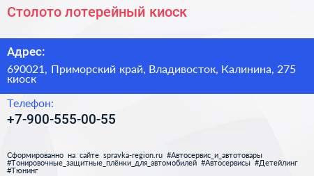 Столото, лотерейный киоск по адресу 690021, Приморский край, Владивосток, Калинина, 275 киоск в дальнейшем Организация, размещена в следующих категориях: