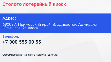 Столото, лотерейный киоск по адресу 690037, Приморский край, Владивосток, Адмирала Юмашева, 2г киоск в дальнейшем Организация, размещена в следующих категориях: