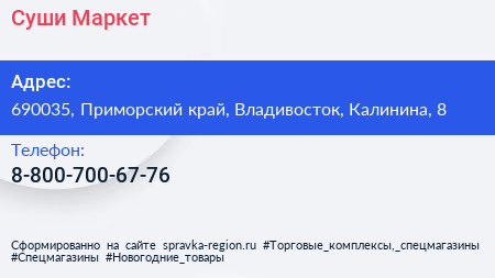 Суши-Маркет по адресу 690035, Приморский край, Владивосток, Калинина, 8 в дальнейшем Организация, размещена в следующих категориях: