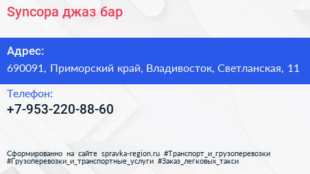 Syncopa, джаз-бар по адресу 690091, Приморский край, Владивосток, Светланская, 11 в дальнейшем Организация, размещена в следующих категориях: