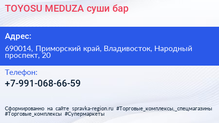 TOYOSU-MEDUZA, суши-бар по адресу 690014, Приморский край, Владивосток, Народный проспект, 20 в дальнейшем Организация, размещена в следующих категориях: