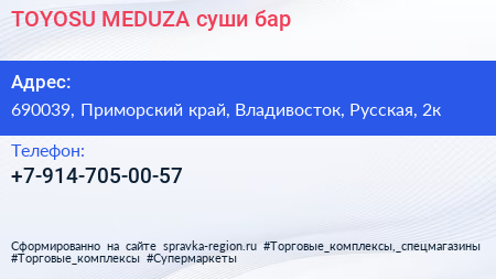 TOYOSU-MEDUZA, суши-бар по адресу 690039, Приморский край, Владивосток, Русская, 2к в дальнейшем Организация, размещена в следующих категориях: