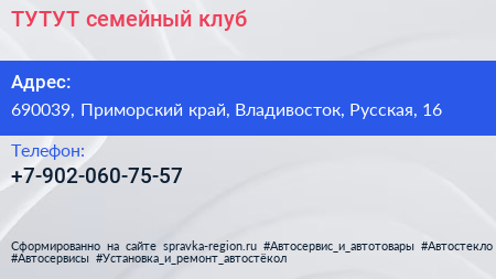 ТУТУТ, семейный клуб по адресу 690039, Приморский край, Владивосток, Русская, 16 в дальнейшем Организация, размещена в следующих категориях:
