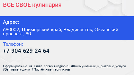 ВСЁ СВОЁ, кулинария по адресу 690002, Приморский край, Владивосток, Океанский проспект, 90 в дальнейшем Организация, размещена в следующих категориях: