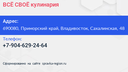 ВСЁ СВОЁ, кулинария по адресу 690080, Приморский край, Владивосток, Сахалинская, 48 в дальнейшем Организация, размещена в следующих категориях: