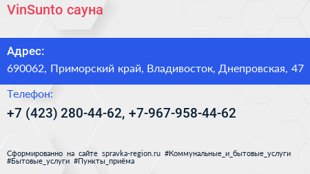 VinSunto, сауна по адресу 690062, Приморский край, Владивосток, Днепровская, 47 в дальнейшем Организация, размещена в следующих категориях: