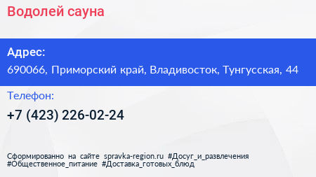 Водолей, сауна по адресу 690066, Приморский край, Владивосток, Тунгусская, 44 в дальнейшем Организация, размещена в следующих категориях: