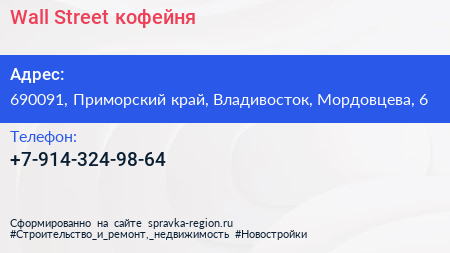 Wall Street, кофейня по адресу 690091, Приморский край, Владивосток, Мордовцева, 6 в дальнейшем Организация, размещена в следующих категориях: