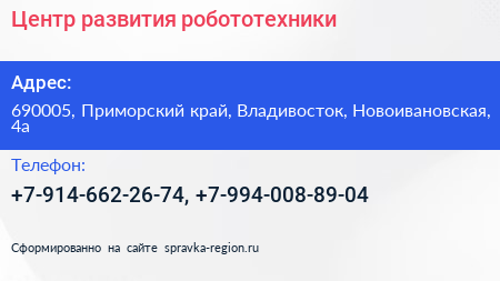 Центр развития робототехники по адресу 690005, Приморский край, Владивосток, Новоивановская, 4а в дальнейшем Организация, размещена в следующих категориях:
