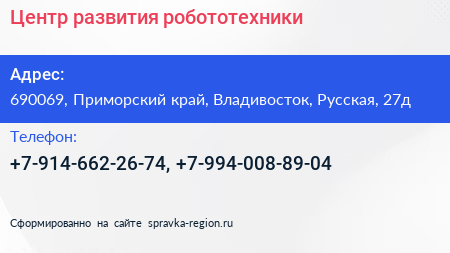 Центр развития робототехники по адресу 690069, Приморский край, Владивосток, Русская, 27д в дальнейшем Организация, размещена в следующих категориях: