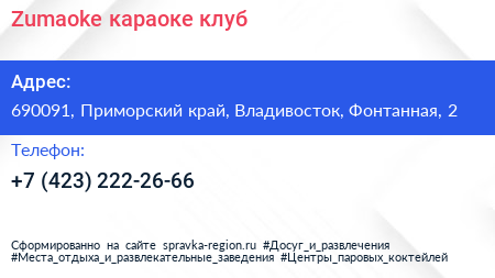 Zumaoke, караоке-клуб по адресу 690091, Приморский край, Владивосток, Фонтанная, 2 в дальнейшем Организация, размещена в следующих категориях: