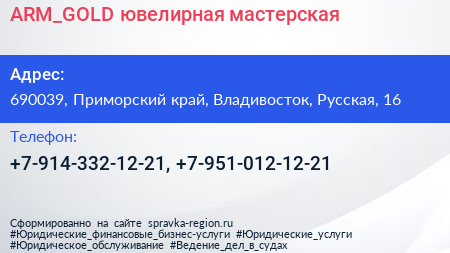ARM_GOLD, ювелирная мастерская по адресу 690039, Приморский край, Владивосток, Русская, 16 в дальнейшем Организация, размещена в следующих категориях: