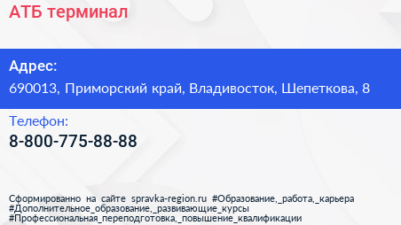 АТБ, терминал по адресу 690013, Приморский край, Владивосток, Шепеткова, 8 в дальнейшем Организация, размещена в следующих категориях: