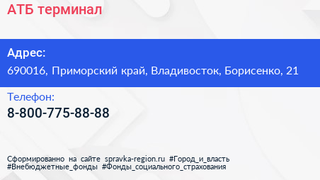 АТБ, терминал по адресу 690016, Приморский край, Владивосток, Борисенко, 21 в дальнейшем Организация, размещена в следующих категориях: