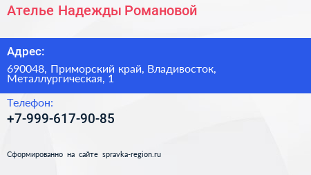 Ателье Надежды Романовой по адресу 690048, Приморский край, Владивосток, Металлургическая, 1 в дальнейшем Организация, размещена в следующих категориях: