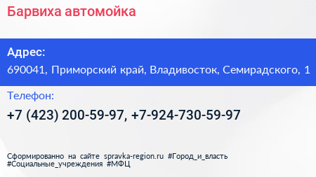 Барвиха, автомойка по адресу 690041, Приморский край, Владивосток, Семирадского, 1 в дальнейшем Организация, размещена в следующих категориях: