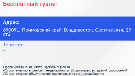 Бесплатный туалет по адресу 690091, Приморский край, Владивосток, Светланская, 29 ст2 в дальнейшем Организация, размещена в следующих категориях: