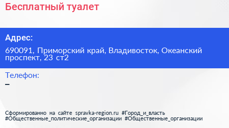 Бесплатный туалет по адресу 690091, Приморский край, Владивосток, Океанский проспект, 23 ст2 в дальнейшем Организация, размещена в следующих категориях: