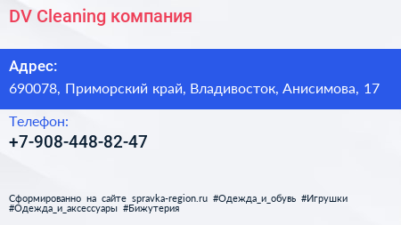 DV-Cleaning, компания по адресу 690078, Приморский край, Владивосток, Анисимова, 17 в дальнейшем Организация, размещена в следующих категориях:
