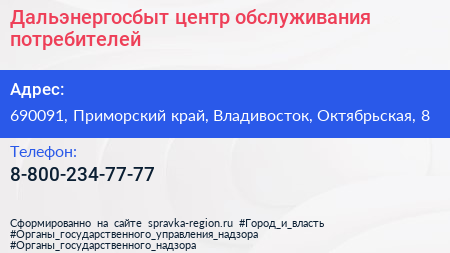 Дальэнергосбыт, центр обслуживания потребителей по адресу 690091, Приморский край, Владивосток, Октябрьская, 8 в дальнейшем Организация, размещена в следующих категориях: