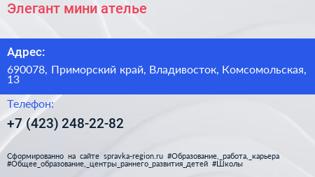Элегант, мини-ателье по адресу 690078, Приморский край, Владивосток, Комсомольская, 13 в дальнейшем Организация, размещена в следующих категориях: