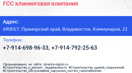 FCC, клининговая компания по адресу 690017, Приморский край, Владивосток, Коммунаров, 21 в дальнейшем Организация, размещена в следующих категориях: