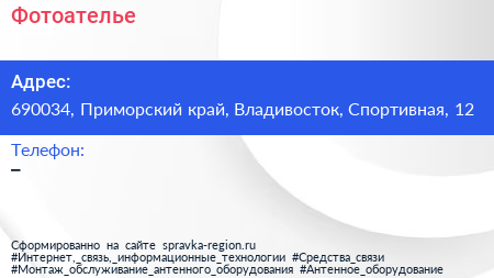 Фотоателье по адресу 690034, Приморский край, Владивосток, Спортивная, 12 в дальнейшем Организация, размещена в следующих категориях: