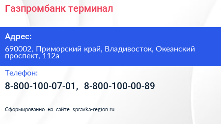 Газпромбанк, терминал по адресу 690002, Приморский край, Владивосток, Океанский проспект, 112а в дальнейшем Организация, размещена в следующих категориях: