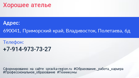 Хорошее ателье по адресу 690041, Приморский край, Владивосток, Полетаева, 6д в дальнейшем Организация, размещена в следующих категориях: