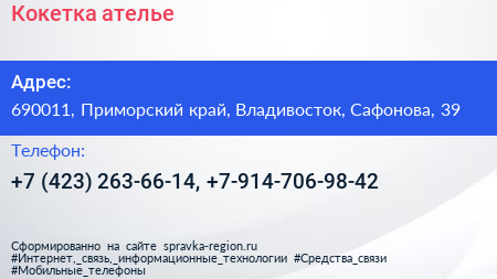 Кокетка, ателье по адресу 690011, Приморский край, Владивосток, Сафонова, 39 в дальнейшем Организация, размещена в следующих категориях:
