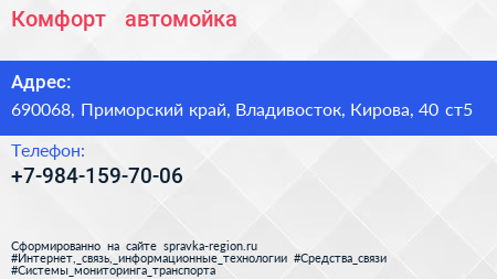 Комфорт +, автомойка по адресу 690068, Приморский край, Владивосток, Кирова, 40 ст5 в дальнейшем Организация, размещена в следующих категориях: