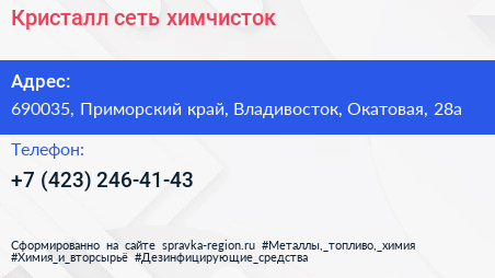 Кристалл, сеть химчисток по адресу 690035, Приморский край, Владивосток, Окатовая, 28а в дальнейшем Организация, размещена в следующих категориях: