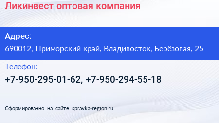 Ликинвест, оптовая компания по адресу 690012, Приморский край, Владивосток, Берёзовая, 25 в дальнейшем Организация, размещена в следующих категориях: