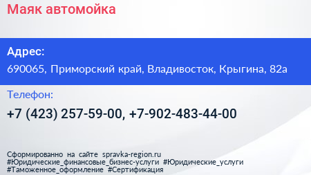 Маяк, автомойка по адресу 690065, Приморский край, Владивосток, Крыгина, 82а в дальнейшем Организация, размещена в следующих категориях: