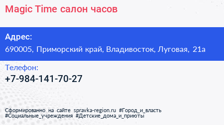 Magic Time, салон часов по адресу 690005, Приморский край, Владивосток, Луговая, 21а в дальнейшем Организация, размещена в следующих категориях: