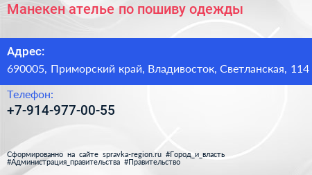 Манекен, ателье по пошиву одежды по адресу 690005, Приморский край, Владивосток, Светланская, 114 в дальнейшем Организация, размещена в следующих категориях: