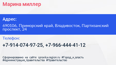 Марина-миллер по адресу 690106, Приморский край, Владивосток, Партизанский проспект, 24 в дальнейшем Организация, размещена в следующих категориях: