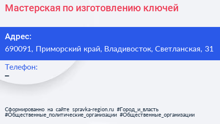 Мастерская по изготовлению ключей по адресу 690091, Приморский край, Владивосток, Светланская, 31 в дальнейшем Организация, размещена в следующих категориях:
