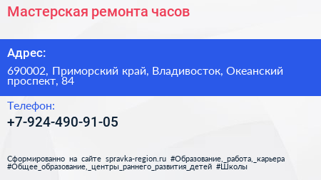 Мастерская ремонта часов по адресу 690002, Приморский край, Владивосток, Океанский проспект, 84 в дальнейшем Организация, размещена в следующих категориях: