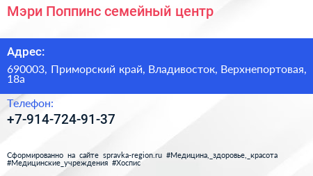 Мэри Поппинс, семейный центр по адресу 690003, Приморский край, Владивосток, Верхнепортовая, 18а в дальнейшем Организация, размещена в следующих категориях: