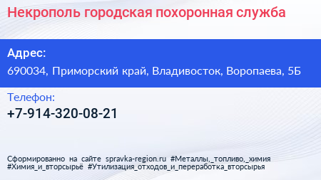 Некрополь, городская похоронная служба по адресу 690034, Приморский край, Владивосток, Воропаева, 5Б в дальнейшем Организация, размещена в следующих категориях:
