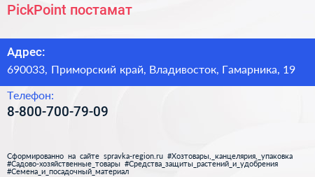 PickPoint, постамат по адресу 690033, Приморский край, Владивосток, Гамарника, 19 в дальнейшем Организация, размещена в следующих категориях: