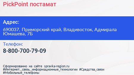 PickPoint, постамат по адресу 690037, Приморский край, Владивосток, Адмирала Юмашева, 7Б в дальнейшем Организация, размещена в следующих категориях: