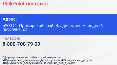 PickPoint, постамат по адресу 690014, Приморский край, Владивосток, Народный проспект, 20 в дальнейшем Организация, размещена в следующих категориях: